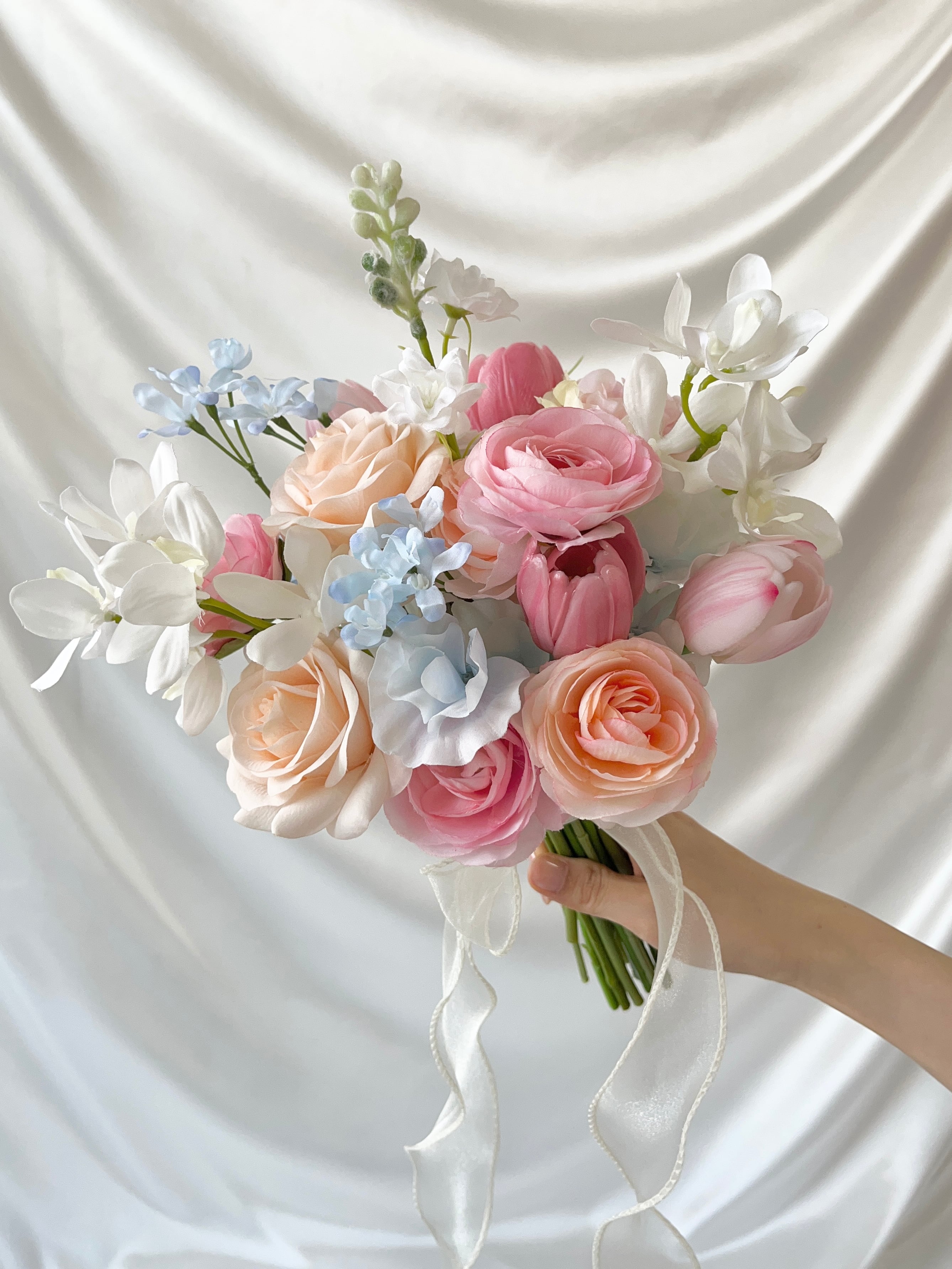 柔らかいパステルカラー、爽やかな水色を差し色に、プリンセスのようなブーケに♡