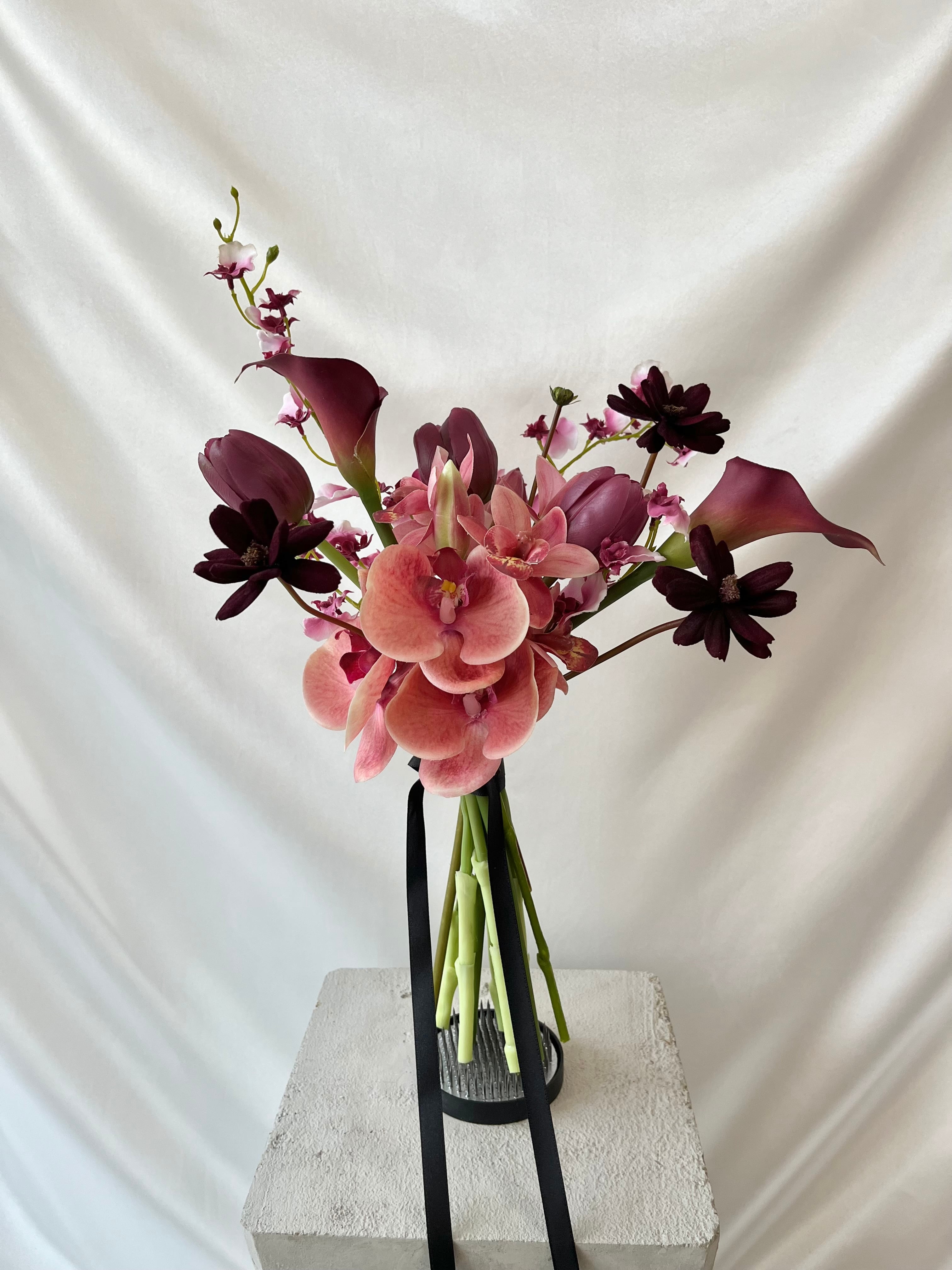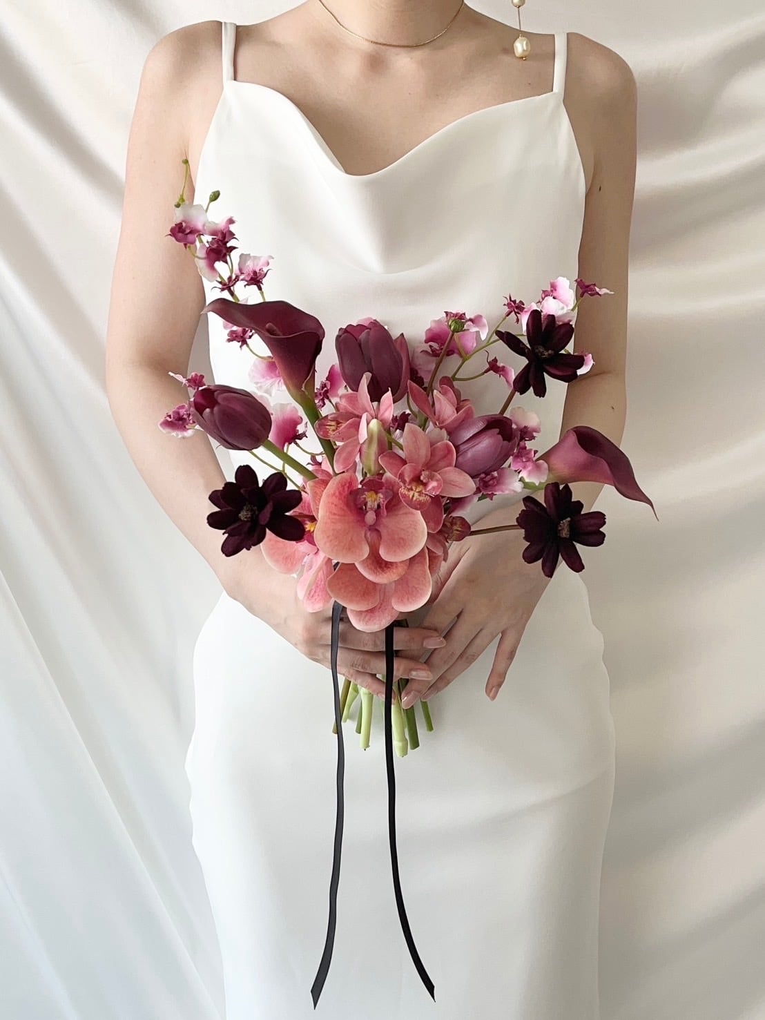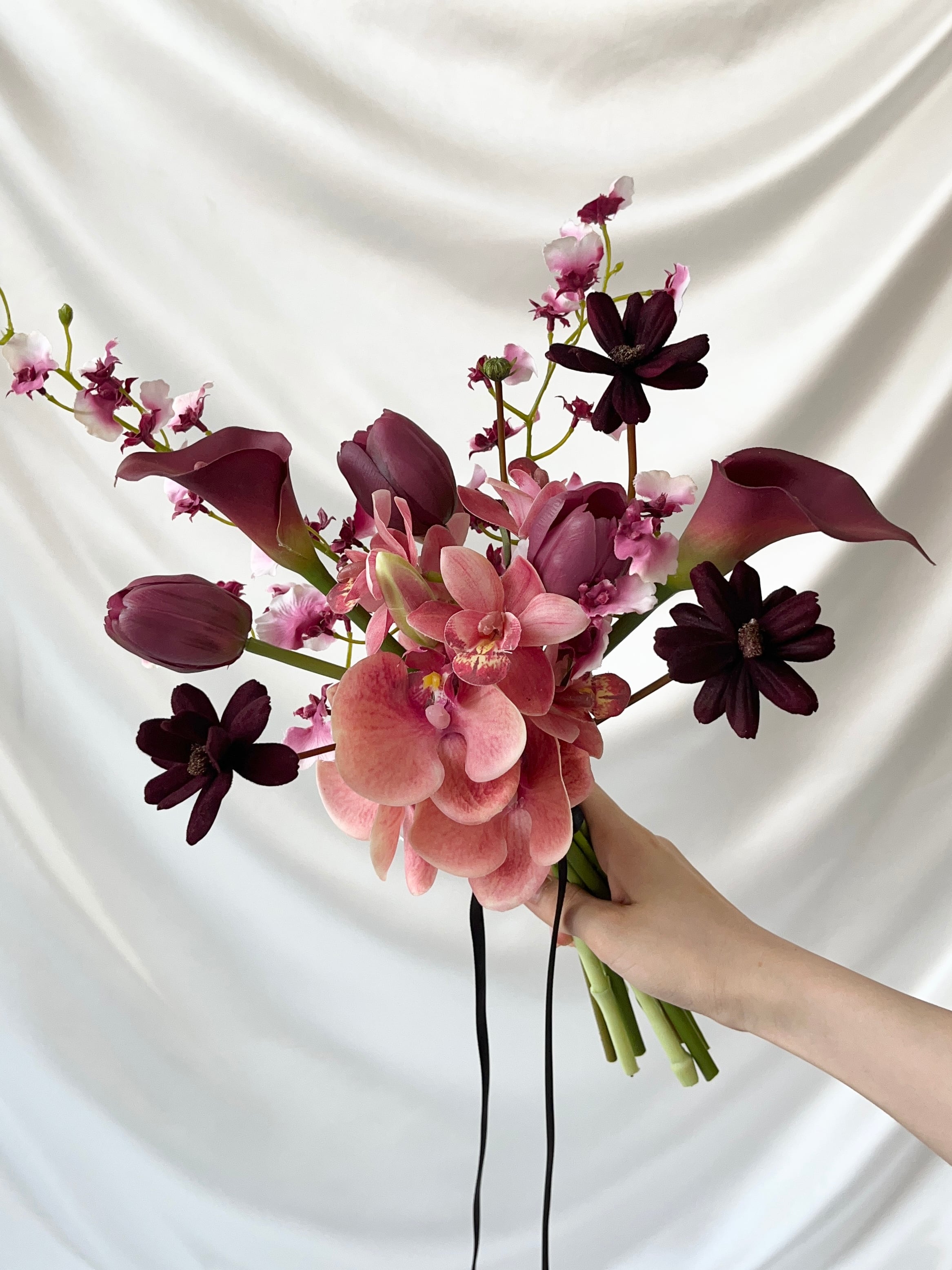 パープル、ピンクの色味の中に、差し色でチョコレートコスモスを入れて大人っぽく…♡