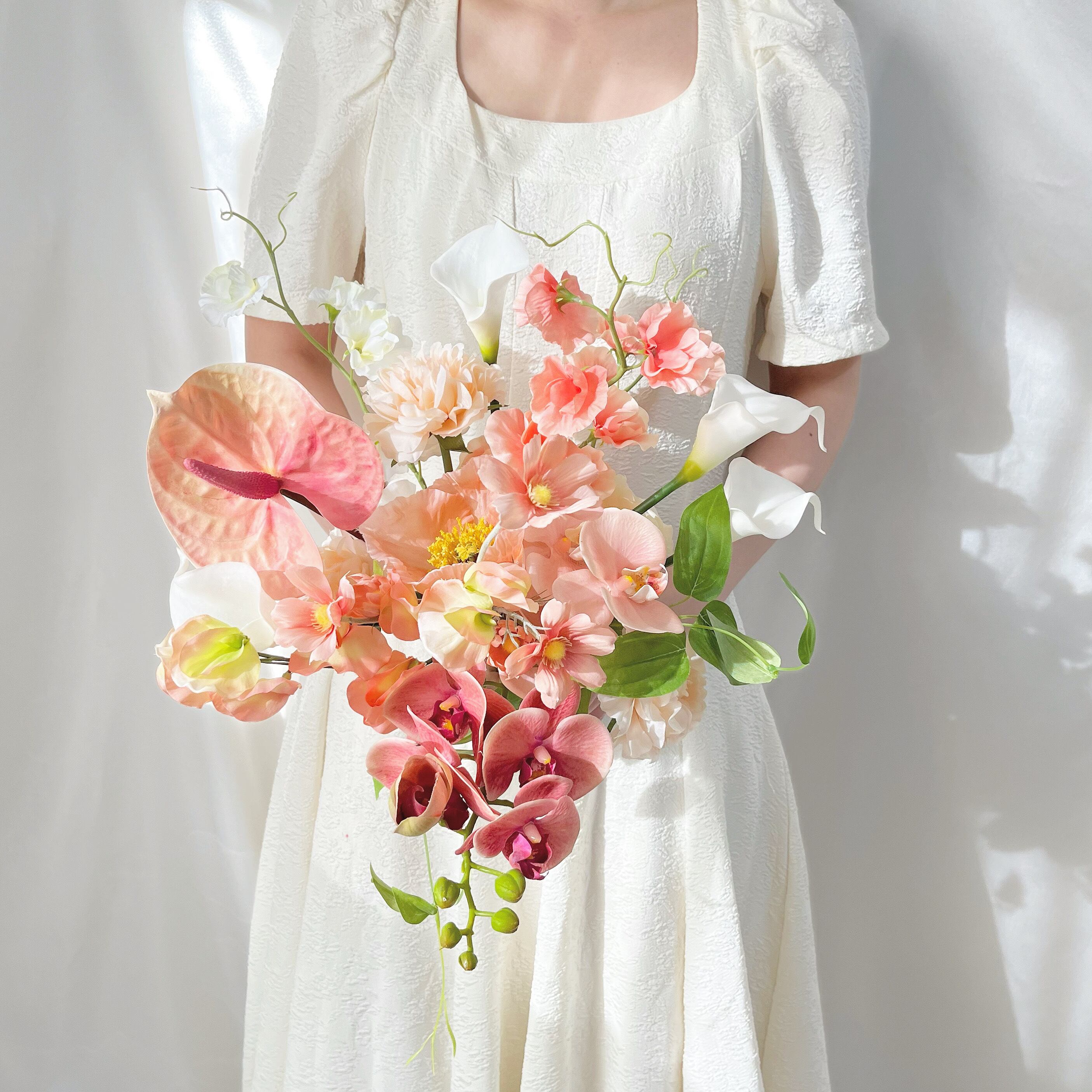 胡蝶蘭2種類、カラー、スイートピー、アンスリウム、差し色にグリーンのリュウキュウソウをメインに束ねました