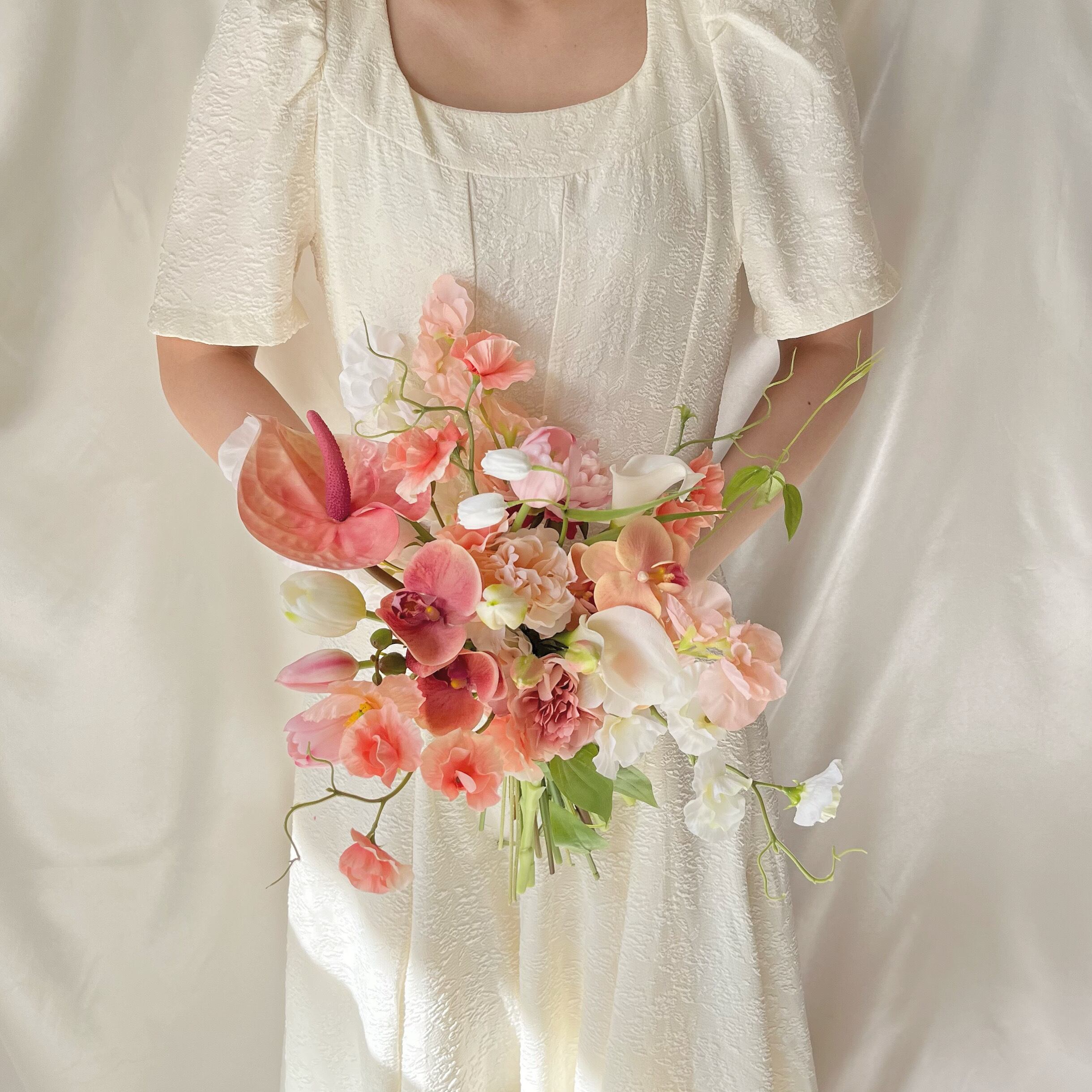アンス、胡蝶蘭、カラー、リュウキュウソウ、スイートピー、チューリップなどを束ねたクラッチブーケです◎