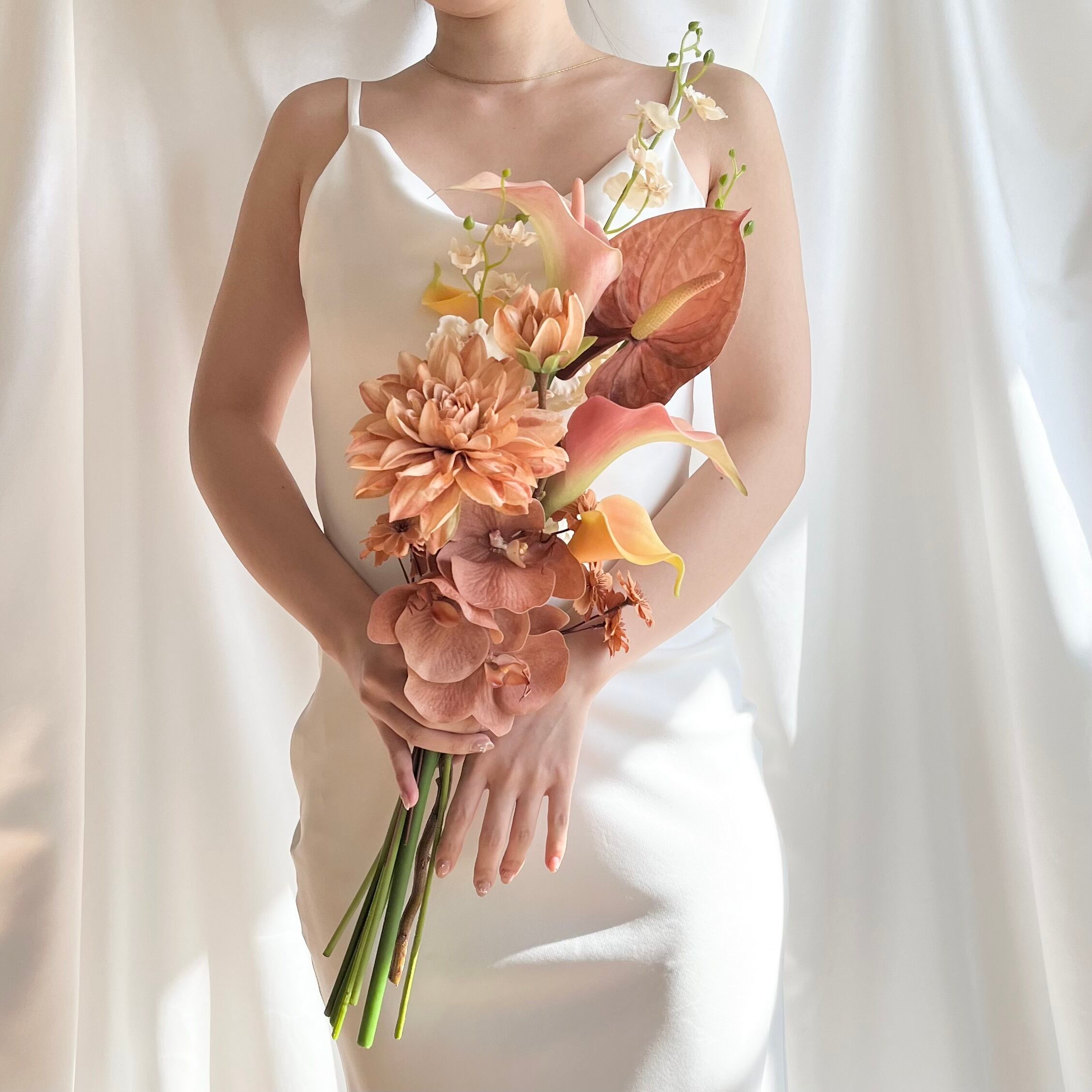 結婚式当日や、前撮りなどの長時間の使用でも、生花のように萎れることなく、いつまでも美しく保っていられます☺︎